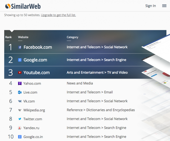 По данным аналитической компании SimilarWeb, социальная сеть ВКонтакте и поисковая система Яндекс вошли в десятку самых популярных сайтов в мире. Тремя самыми популярными ресурсами в мире стали социальная сеть Facebook, поисковик Google и видеохостинг YouTube, затем следуют Yahoo! и Live.com, а уже на шестом месте расположилась российская социальная сеть ВКонтакте. Затем следуют Wikipedia и Twitter, а девятое место занимает Яндекс.